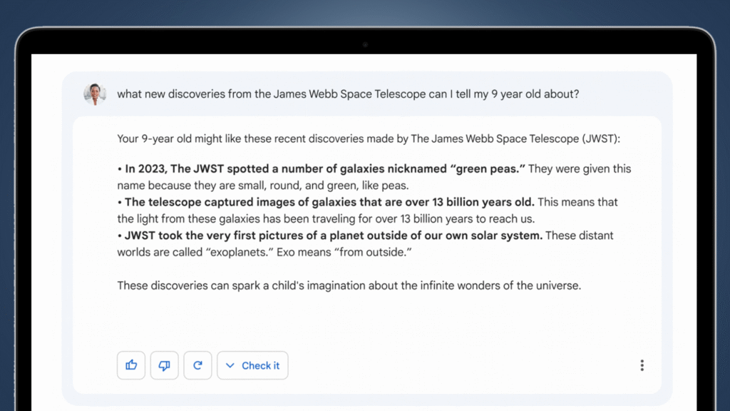 Melalui sebuah gambar yang dibagikan oleh Google di platform X, terlihat Bard menjawab pertanyaan terkait penemuan baru dari Teleskop Luar Angkasa James Webb dengan tiga poin, satu di antaranya menyatakan bahwa teleskop tersebut mengambil gambar pertama sebuah planet di luar tata surya kita. Pada kenyataannya pernyataan tersebut tidak benar, mengutip pada website NASA bahwa gambar pertama planet di luar tata surya kita diambil pada tahun 2004 dengan VLT (Very Large Telescope), tidak seperti jawaban yang telah diberikan oleh Bard AI.